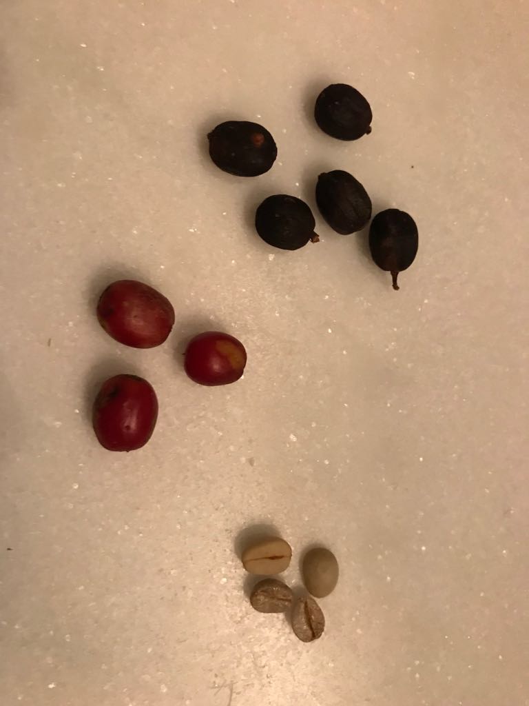 Robert picked these yesterday afternoon. Red acaia beans, 3 nice ripe ones, plus some over-ripe. Like raisins on a vine, the black bean looks unappetising but is a coffee cuppers delight. The ‘mucilage’ (flesh) on the cherry, rather than being removed by mechanical ‘pulping’ has been absorbed into the bean, giving it a fruity sweetness.